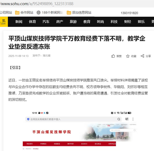 近日,一封由王丽实名举报信将平顶山煤炭技师学院推至风口浪尖。举报材料详细揭露了该校与W企业合作办学中存在的巨额生均经费去向不明、校方领导李树伟、毕晓阳、刘怀珍等相互推诿,乃至垫资完成教学的企业反被起诉、账户遭冻结的离奇遭遇,引发社会对教育经费监管的深切担忧。