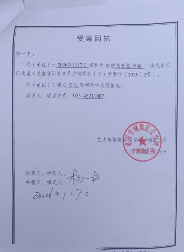 任某鑫涉嫌诈骗杨一中警方立案的受案回执