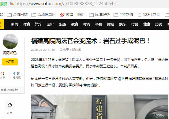 2026年3月27日,福建省十四届人大常委会第二十一次会议,因工作需要,免去陈某的福建省高级人民法院审判委员会委员、民事审判第三庭庭长、审判员职务。